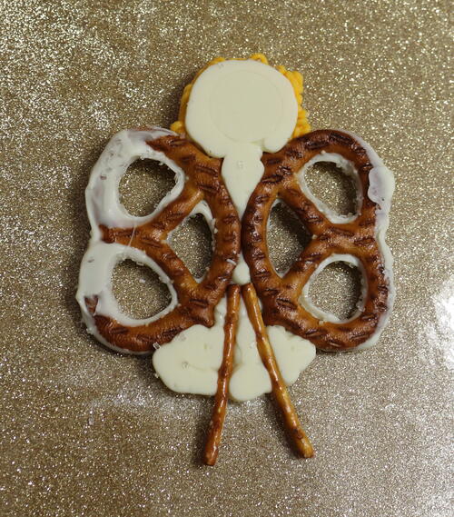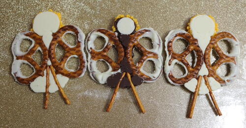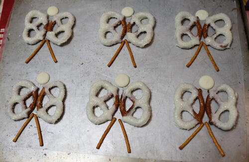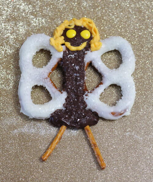 After wings dry, lay them out on wax paper. Lay out 2 pretzel sticks for legs, and one unmelted wafer for the head base.