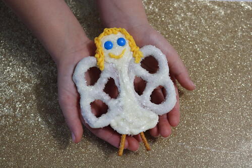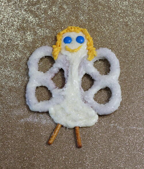 Dip large pretzels in white or dark chocolate, depending on what color angel you are making. Mix white and dark together to make various shades of "skin" tones (do angels have skin?).