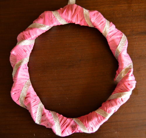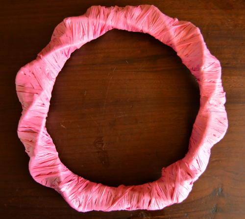 Use a bit of craft glue to secure the end of the raffia at the back of the ring. Wrap the raffia tightly around the ring until the whole ring has been covered with raffia. Cut off any remaining raffia and glue the second end of the raffia in place at the back of the ring. -