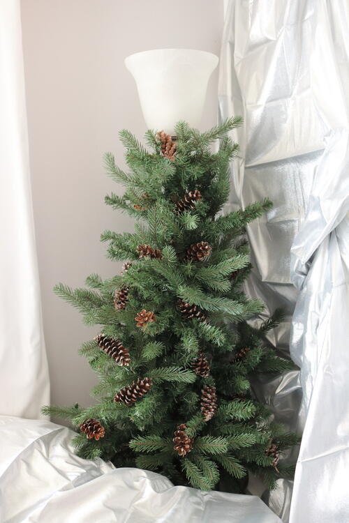 "I dressed up my floor lamp and turned it into a Christmas tree! I used faux evergreen branches from a discarded Christmas tree and wrapped them them around my lamp's pole. First, I wrapped a cardboard tube from wrapping paper around the post to protect it. Then I used smaller branches at the top, working my way down, and used larger branches at the bottom.I secured it by wrapping the branches around each other. Then I decorated it with pine cones. It is such a space saver!"