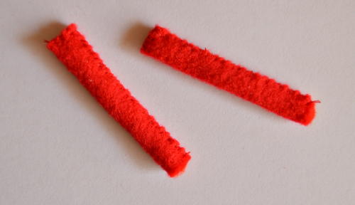 b. Take the first strip of red felt. Fold it in half so that the two long sides will be on top of one another. Stitch up the small opening and then stitch the sides together. Push one of the pieces of pipe cleaner into the sleeve before stitching up the last opening.